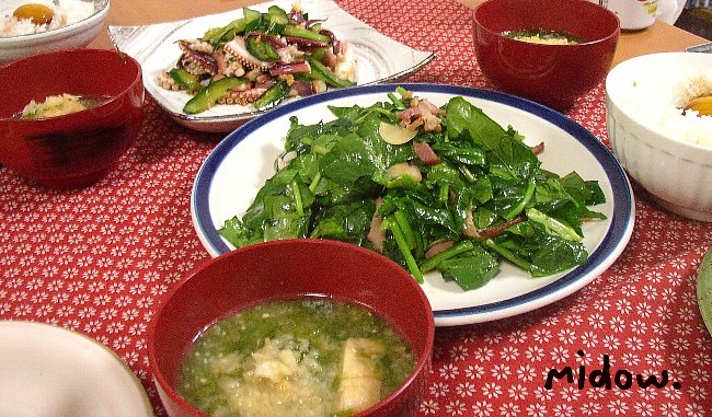 ほうれん草、たっぷりソテー・・・洗って切ったほうれん草を暫く水にさらし、ザル上げ。多めオイル+塩+ベーコン+ニンニクを熱したフライパンにほうれん草投入。強火でがーっとしたら、醤油で味付け。すぐに火を消す。 アレンジでカレー粉振ってもおいすぃ♪