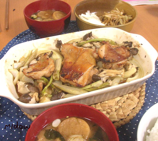 和風グリルチキン・・・季節野菜・・(今回はタマネギ・ウド・シメジ)をグリル皿に入れ、塩胡椒。鳥ももを切って麺つゆ味で漬け、レンジで加熱。野菜の入ったグリル皿にチキンを汁ごとのっけ、焼き目が付くまで焼きましょう~