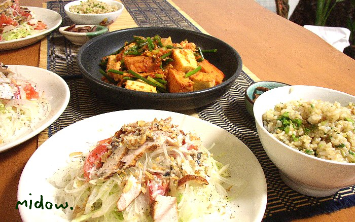 厚揚げキムチ炒め・メカジキバージョン・・・切ったカジキをごま油で炒め、キムチを汁ごと投入。切った厚揚げを入れ、一煮立ち。ニラをいれて、醤油で味を整える。