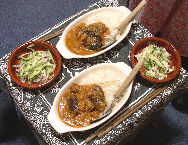 ナスとチキンのカレーと、バンバンジー風サラダ。
