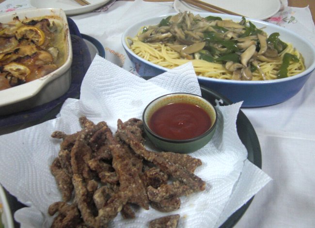 塩コショウした細切りレバーに片栗粉まぶして揚げる。
